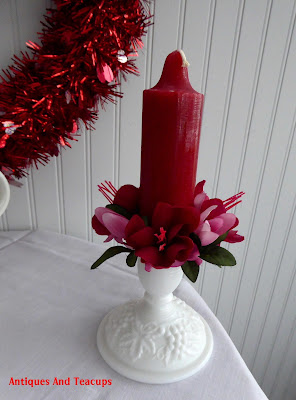 The canle holders are milk glass from Antiques And Teacups, and I added some red pillar candles I still have hanging around and silk pink and red fuschia bobeches...or candle rings, if you aren't familiar with that term...